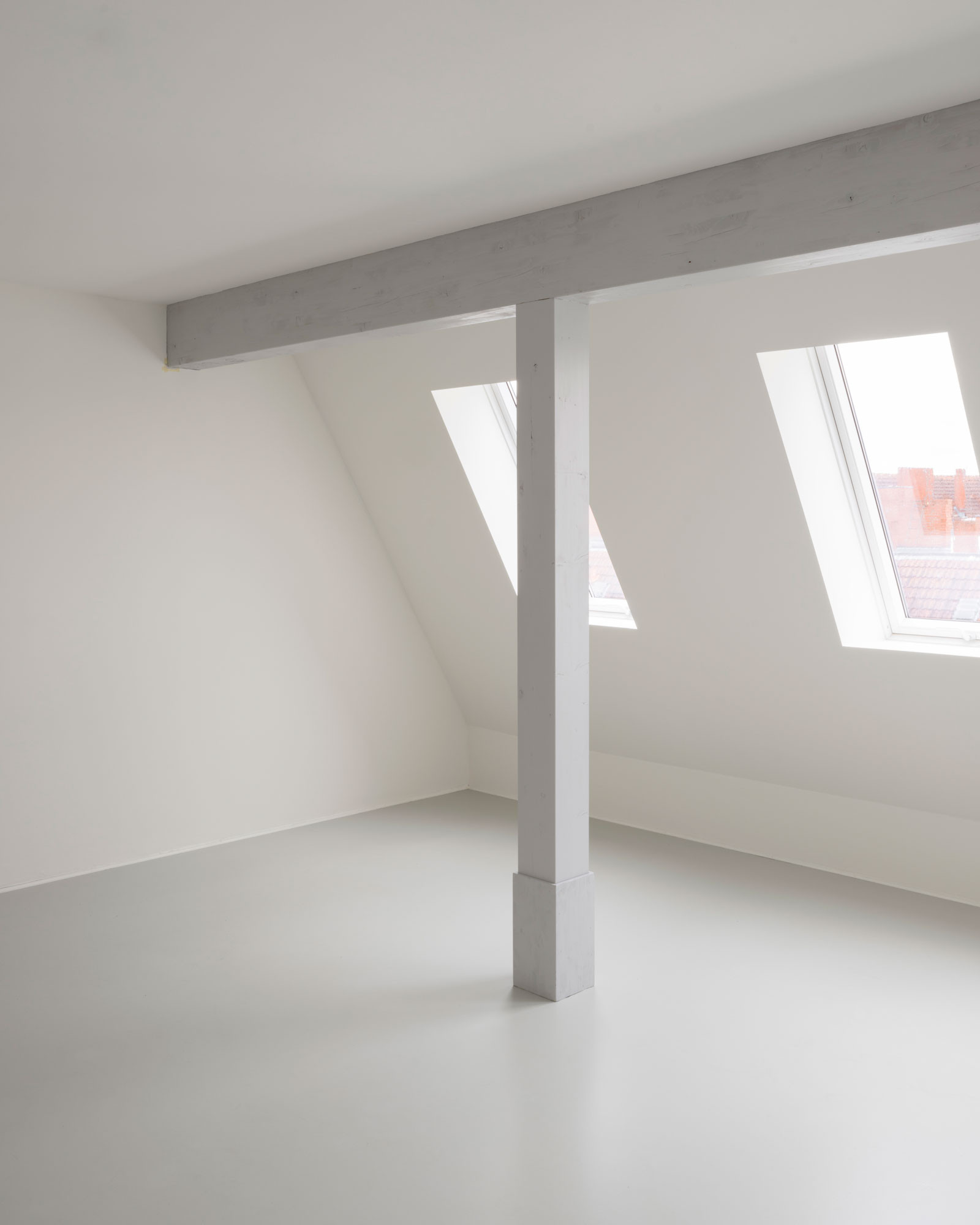 The generic layout of each flat, its utmost reduction to what is needed, offers a flexible appropriation and adaption by its inhabitants serving as a petri dish and framework for various forms of inhabitation. While being only 38m² small, each apartment provides all functional necessities and spatial qualities a studio flat needs. All ameneties such as bathroom, kitchenette and storage are pushed agains the back wall, leaving a spacious open plan living area to be adapted by each inhabitant. The entrance hall and bathroom act as an acoustic barrier between the stairwell and the living spaces while forming a niche that works as a sleeping area, seperable from the main living room with curtains. All drywalling is reduced in height, clearing storage space above bathroom and hall.