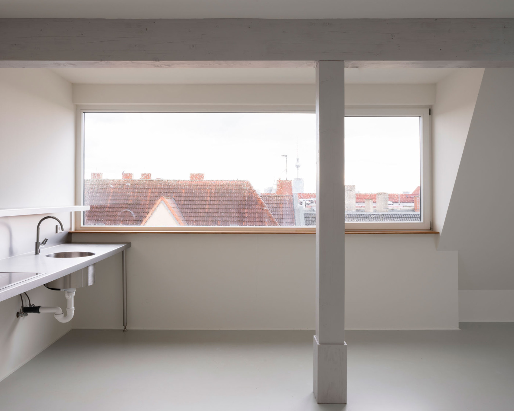 The Ausbauküche is a counter-proposal. Designed as a robust stainless steel kitchen, it provides a sink, stove, worktop and basic storage in one and adapts to the standard modules of the major kitchen manufacturers. This means that the kitchen can be extended in a wide variety of ways and adapted to the needs of the respective occupants. Base units, fridges, dishwashers, mobile cabinets, etc. can be fitted precisely under the worktop. And wall units, shelves, extractor bonnets, etc. can be configured above the worktop as required, but the kitchens are also visible and fully usable without the need for extensions, giving the flats a cosy appearance even without a lot of furniture. The kitchens are therefore highly efficient to use, can be produced cost-effectively as basic equipment and are durable for decades thanks to their materiality.